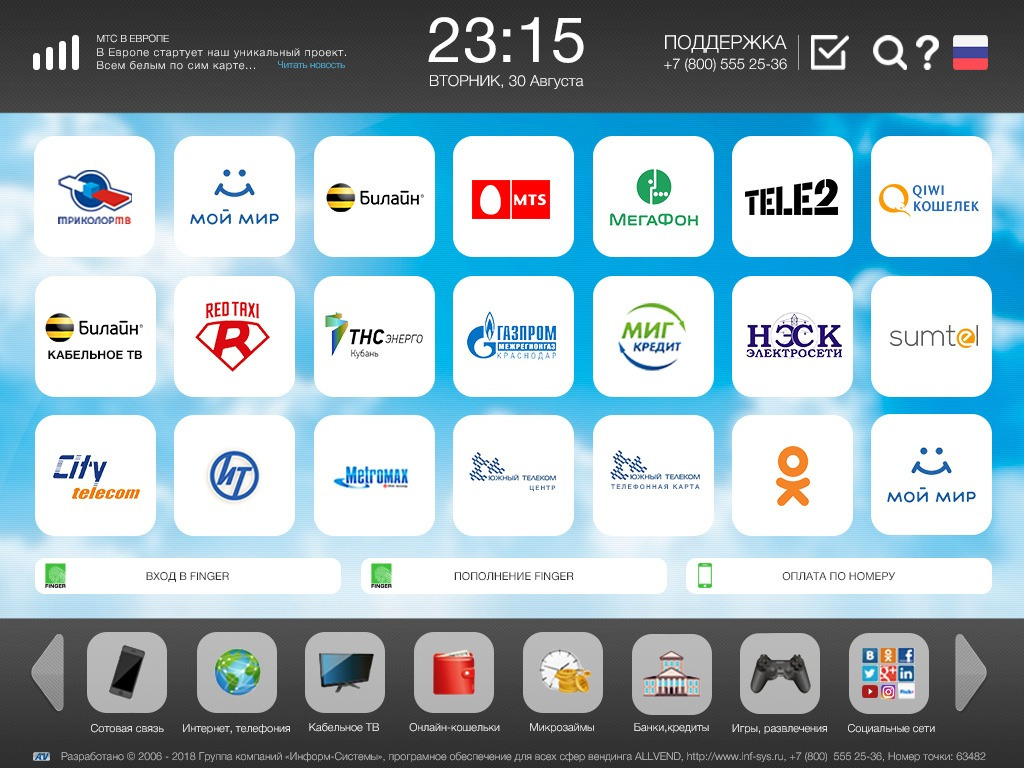 Описание: | Система SkySend представляет программное обеспечение для платежных терминалов, которое обладает рядом отличительных преимуществ: 1. Современный дизайн, анимированный интерфейс 2. Оплата услуг по QR-коду 3. Интеллектуальная сортировка кнопок оплаты по территориальному признаку и частоте поступления платежей 4. Автоматическое определение оператора связи по введенному номеру телефона 5. Возможность создавать индивидуальные дизайны экранов 6. Автоматическое исправление ошибок в работе купюроприемника и принтера, восстановление интернет-соединения без вмешательства технического специалиста ПО Системы SkySend запускается и работает с флеш-накопителя, который содержит операционную систему и программное обеспечение терминала. ПО автоматически определяет все устройства, благодаря чему его запуск терминала в работу занимает 15 минут! Перевод терминалов на работу с Системой SkySend осуществляется БЕСПЛАТНО. Узнайте все подробности по телефону +7 (800) 555-25-36 или отправив письмо с темой "ПО терминалов нового поколения" на электронную почту sales@inf-sys.ru Программное обеспечение ALLVEND для систем самообслуживания |